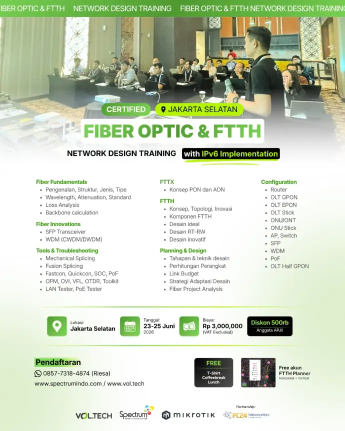 - Materi pelatihan yang komprehensif dan relevan dengan dunia industri FTTH